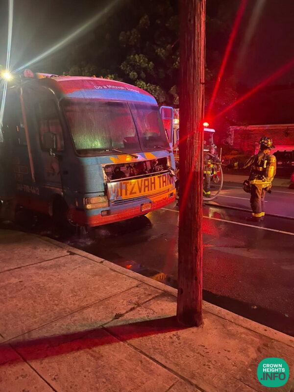 Video from a witness shows smoke and flames shooting from the side of the tank, presumably the site of the Mitzvah Tank’s electrical panel.