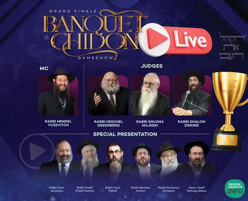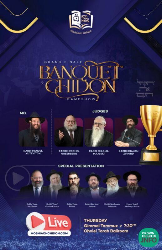 Tonight, night of Gimmel Tammuz, the Oholei Torah Ballroom will host the International Moshiach Chidon. This event, which includes a 4-course banquet, is specifically for bochurim who have finished the entire Moshiach Chidon learning curriculum and passed the final test. Their hard work over the past few months has resulted in a deep understanding of Inyonei Moshiach and Geulah, which they are ready to demonstrate at this event.