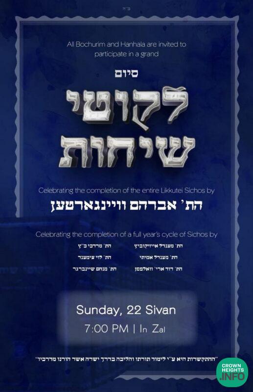 The Siyum also noted six other bochurim of the Yeshiva; Mendel Eizicovics, Mendel Amitai, Dovid Wolfson, Mordechai Katz, Levi Ciment, and Menachem Scheinberger, who that have begun learning Likkutei Sichos and have already completed the first three volumes this year.