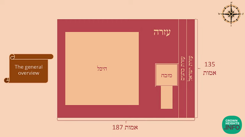 Today’s visual video and quiz of Hilchos Beis Habechira goes through the general overview of the Azarah; from the Heichal to the Mizbeach, and from the Ezras Yisroel to the Ezras Kohanim. You will also see the size of the Azarah relative to the area around 770. You will also see the size of the Ezras Nashim and the Leshachos relative to the area around 770.