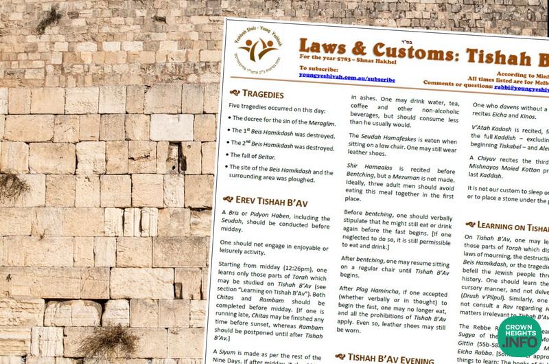 Rabbi Shmuel Lesches, Magid Shiur in the Yeshiva Gedola of Melbourne, Australia, has compiled a guide to the laws and customs of Tishah B’Av for the benefit of the wider Lubavitch community.