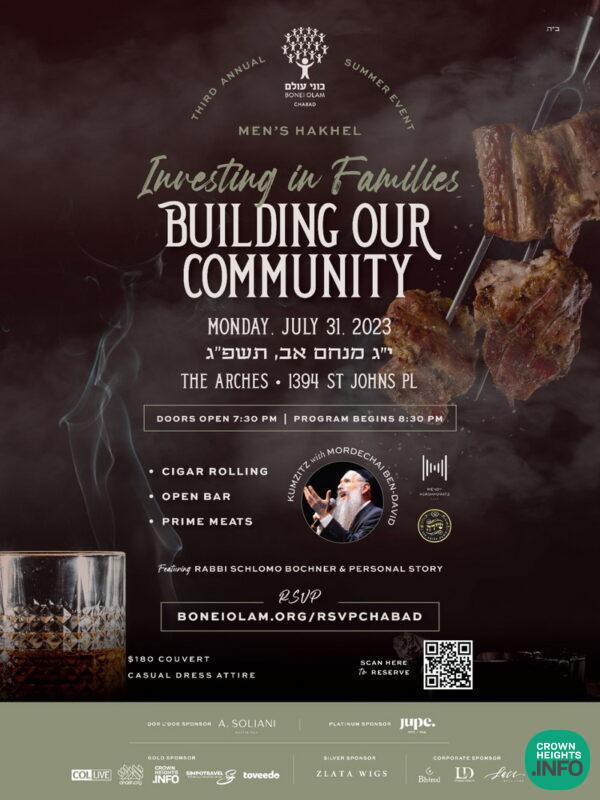 Men, you won’t have to leave the neighborhood this year to show your support. Join us at the Arches, a beautiful venue right here in Crown Heights, for an extraordinary evening featuring an open bar, cigar rolling, gourmet meat buffet and a kumzitz with Mordechai Ben-David and so much more.
