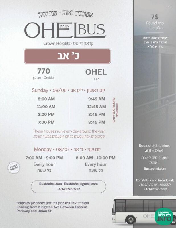 For the auspicious days of Chof Av, the Ohel Bus Service will be providing extra subsidized transportation round trip from Crown Heights to the Ohel on Monday, Chof Av.