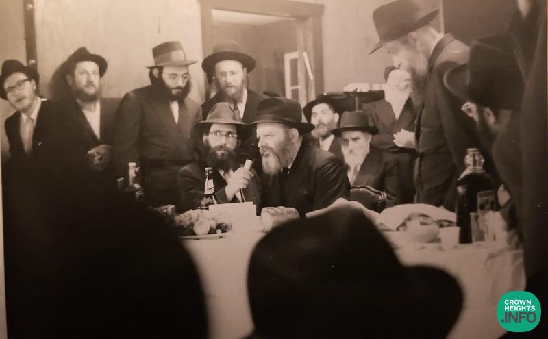 Rabbi Mottel Toloshevsky (facing away from the camera), Rabbi Chodokov, ?, Rabbi Simpson, Rabbi Zalmanov, The Rebbe, Rabbi Meir Harlig (holding the microphone), Rabbi Mentlick (behind Rabbi Harlig), Rabbi Groner, Rabbi Holtzman, and Rabbi Simcha Piekarski.