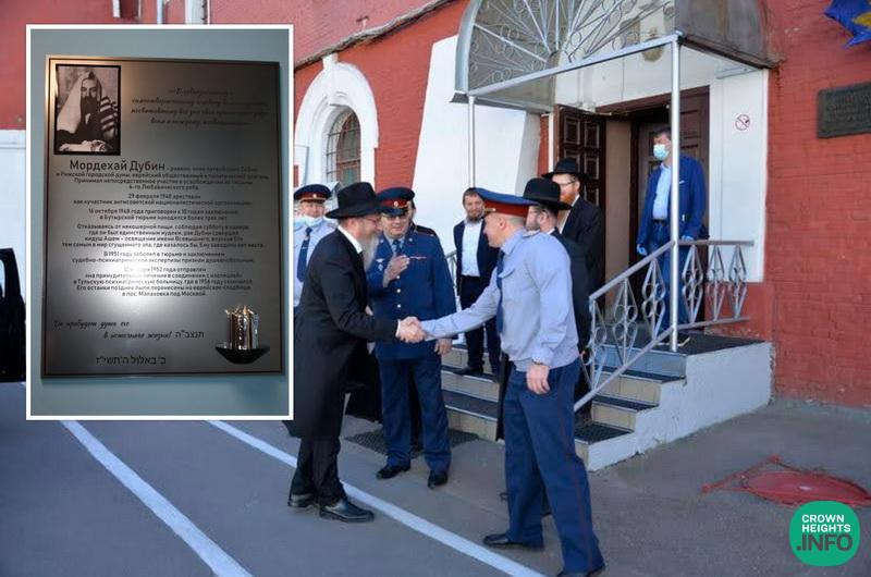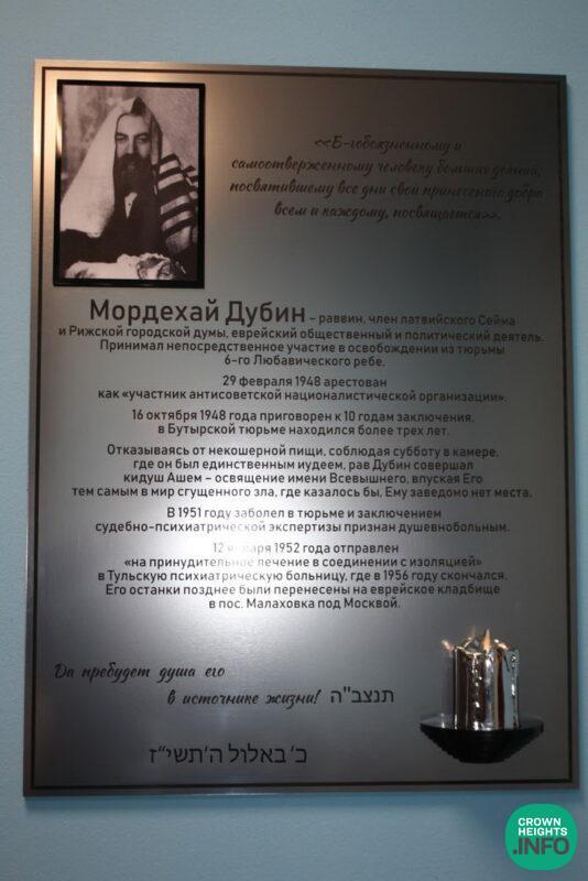 The memorial plaque was arranged after the Chief Rabbi of Russia Berel Lazar visited the prison last Chanuka and at a meeting with the prison administration told them about Rabbi Dubin who had been incarcerated there for 3 years because of his activities for Russian Jewry. They unanimously decided to commemorate his memory with a plaque, and the Prison Chaplain Rabbi Ahron Gurevitch ensured the idea was turned into a reality.
