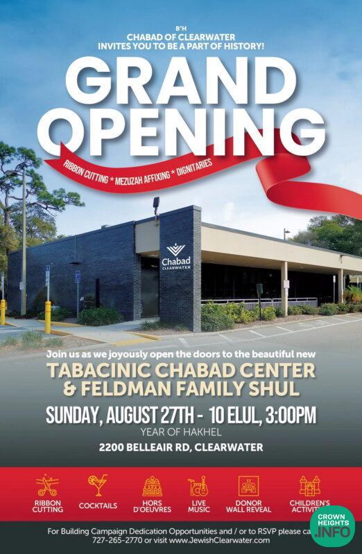More than two hundred people gathered on Sunday, August 27th, the 10th of Elul 5783, for the Grand Opening of the Tabacinic Chabad Center and Feldman Family Shul in Clearwater, FL.