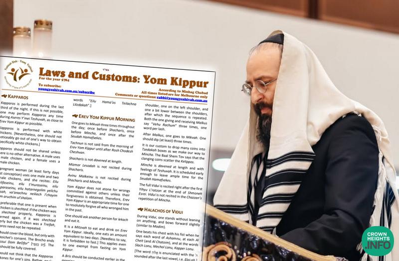 Rabbi Shmuel Lesches, Magid Shiur in the Yeshiva Gedola of Melbourne, Australia, has compiled a guide to the laws and customs of Kapparos, Erev Yom Kippur and Yom Kippur for the benefit of the wider Lubavitch community.