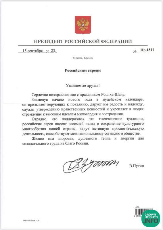 As usual, on the eve of Rosh Hashana, a congratulatory letter from Russian President Vladimir Putin has arrived at the office of the Chief Rabbi of Russia, Rabbi Berel Lazar Shalita.