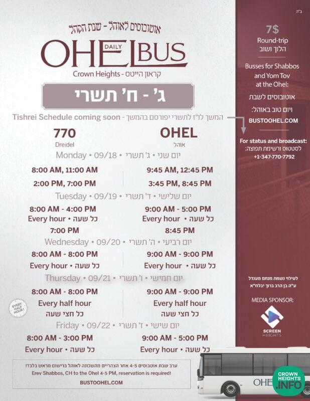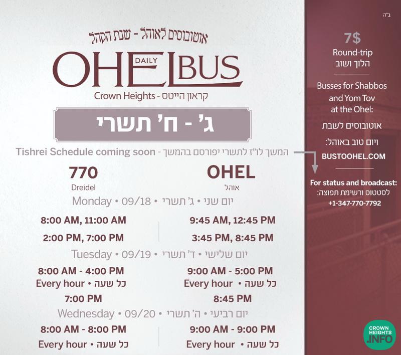 The Ohel Bus Service will be providing extra subsidized transportation round trip from Crown Heights to the Ohel during the week of Aseres Yemei Teshuvah from Monday, the 3rd of Tishrei, through Friday, the 7th if Tishrei.