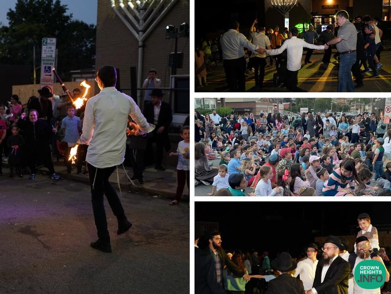 Men, woman, and children filled the street outside of Bnai Emunoh Chabad-Greenfield, in Pittsburgh, PA, as the community celebrated Simchas Bais Hashoeva with singing, dancing, live music, Kosher food, and activities.