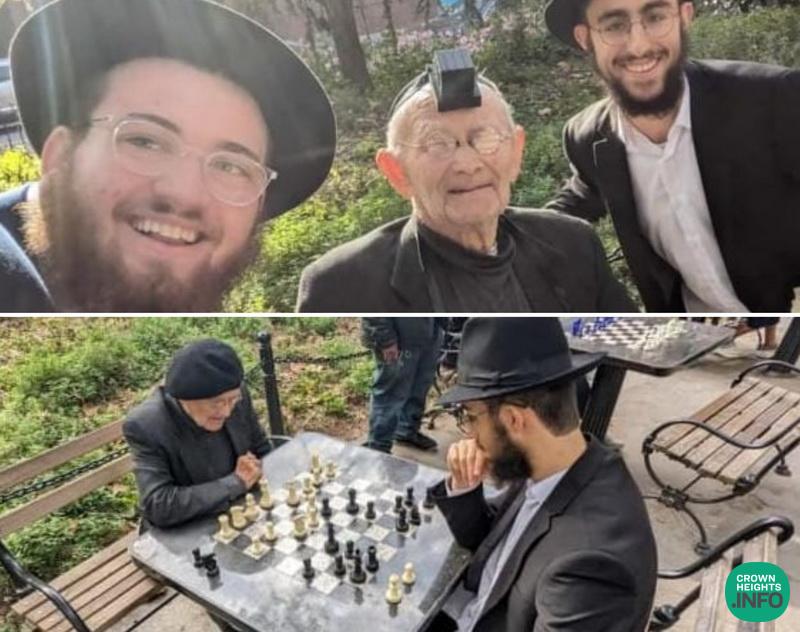 Last Friday, he went on Mivtziem in a park near Crown Heights. He went around among people and suggested that they put on tefillin. In the park there is an area where people sit and play on chess tables. He approached everyone who looked Jewish and he offered them to put on tefillin. One of those who was playing chess pointed him in the direction of someone who was old, and told him he is Jewish and will soon be 102 years old. He suggest that he would put on Tefillin. Alex approached the Jew, and asked him Are you Jewish, the Jew answered him, that he used to be a Jew, but he is no longer Jewish. Alex continued to ask him if he wanted to put on a tefillin. The old Jew did not respond. So Alex suggested he play chess (Alex is a chess champion).