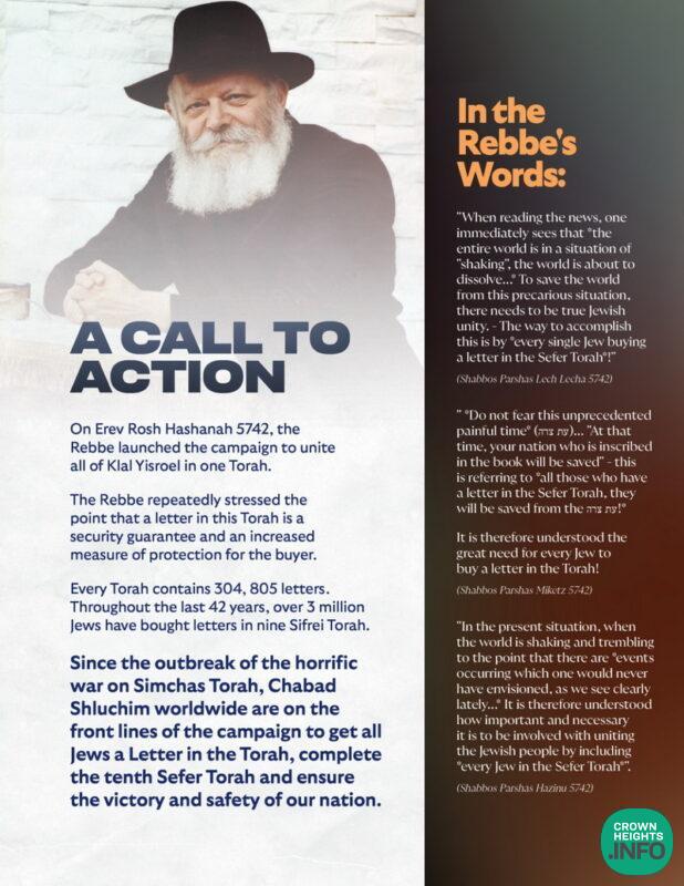 “When reading the news, one immediately sees that the entire world is in a situation of ‘shaking,’ about to dissolve… To save the world from this precarious situation, there needs to be true Jewish unity. The way to accomplish this is for every single Jew to buy a letter in the Sefer Torah!” (Shabbos Parshas Lech Lecha 5742)