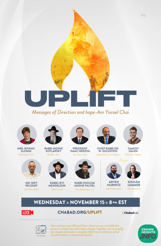 “Uplift! Messages of Direction and Hope,” organized by Merkos 302 at Chabad Headquarters, is scheduled for 8:00 PM tonight, Wednesday, November 15th, 2023. Streaming live on Chabad.org, the virtual gathering will invigorate the global Jewish community with messages of Jewish pride and empowerment from Jewish leaders worldwide.
