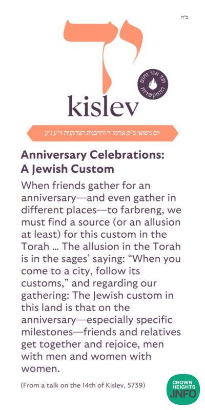 On Yud Daled Kislev 5739 (1978), the 50th anniversary the Rebbe started the Farbrengen by saying that it is the custom in this and other countries that: In the day of an anniversary, family and friends gather to celebrate and rejoice together… This Farbrengen is a great opportunity for every family to join with chassidim from around the world in celebrating this special day.