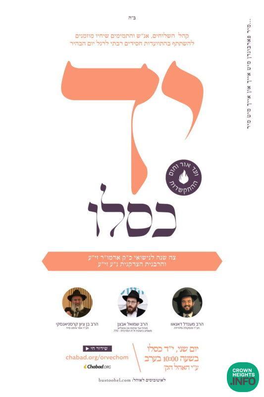 The Farbrengen, organized by Vaad Or Vechom Hahiskashrus, will be addressed by Rabbi Ben Tzion Krasnianski, Chabad Upper East Side, and Rabbi Shmuly Avtzon, Mashpia in 770, and will be emceed by Rabbi Mendel Danow, Chabad Pensacola FL.