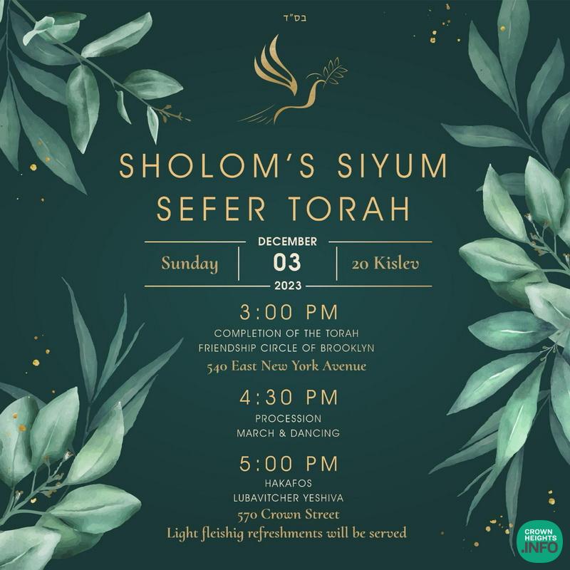 Shalom’s Sefer Torah will be completed at 3:00pm at The Friendship Circle of Brooklyn 540 East New York Ave with the procession leaving there at 4:30 and heading to Lubavitcher Yeshiva Crown Street. 5:00pm Hakafos will be taking place at Lubavitcher Yeshiva. Light refreshments will be served.