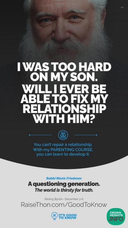 I’m just in time for a new parenting series. I wait until the end to speak privately with Rabbi Manis Friedman. “I have a lot of questions,” I say. He grins, “You’re part of a questioning generation. Welcome.”
