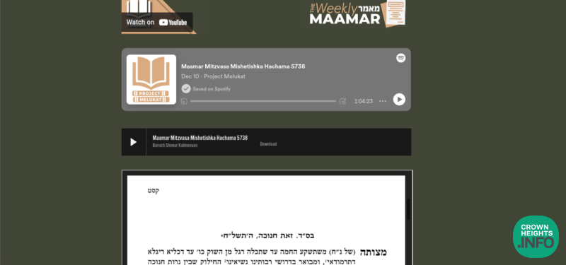 The Weekly Maamar for this week is Mitzvasa Mishetishka Hachama 5738, which is the second Maamar in Kutres Chanukah – 5747, and is a hemshech to Tanu Rabanan Mitzvas Ner Chanukah 5738, and discusses the concepts above.