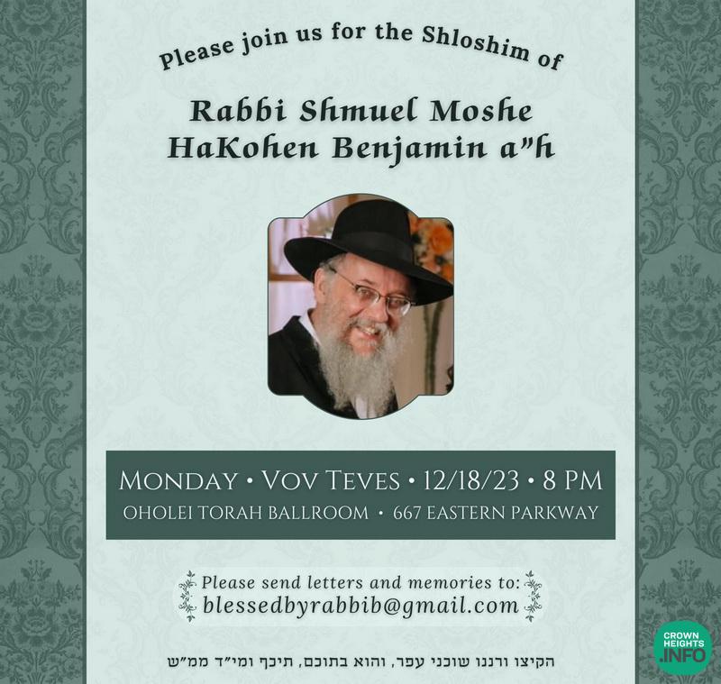 The community is being invited to join the Benjamin Family for a Shloshim event for Rabbi Shmuel Benjamin A”H. The event will be taking place on Monday, Dec. 18th at 8:00pm. The event will be streamed LIVE on Zoom.