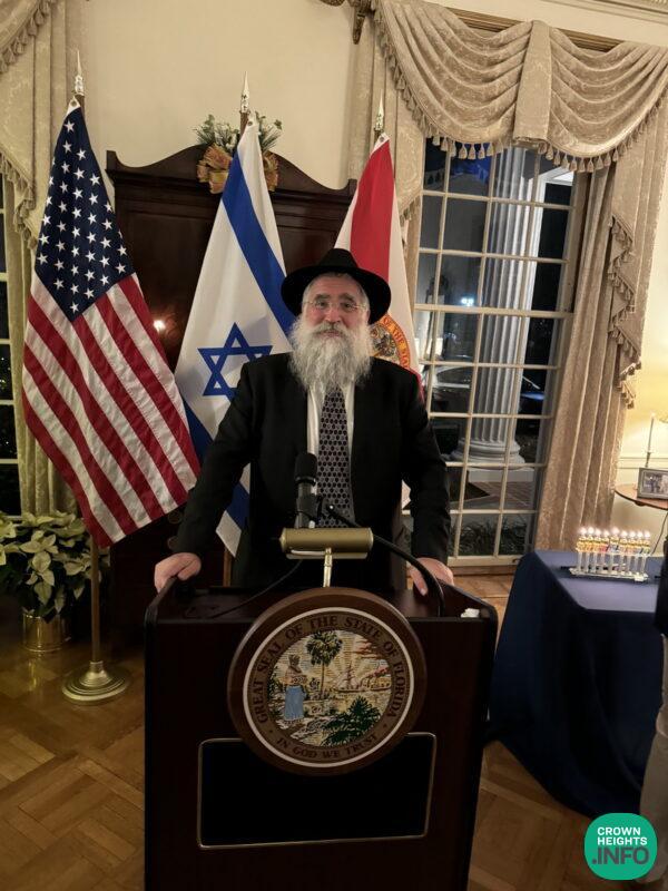Chabad Shliach Rabbi Sholom Lipskar from the Shul of Bal Harbour spoke about the miracle of Chanukah and thanked the Governor for his strong support for the Jewish people and how Florida is the most desirable State to live in.