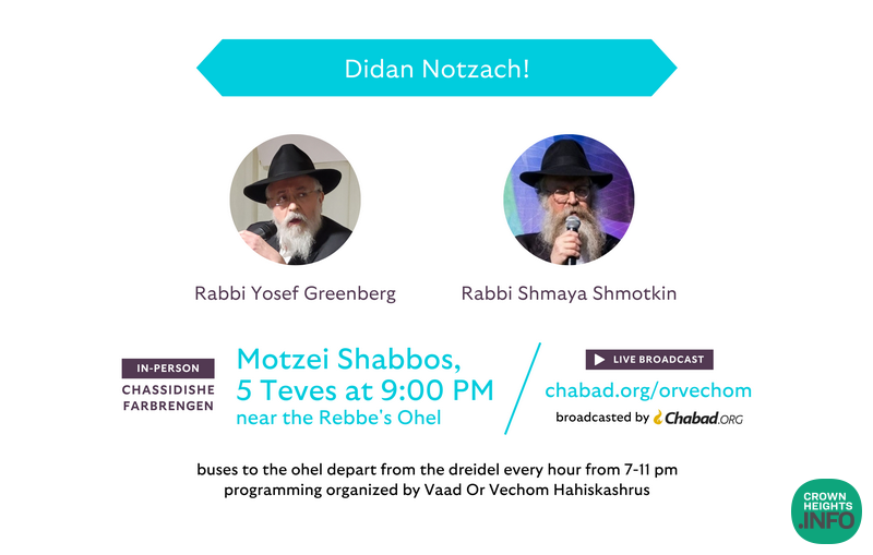 To enable Chassidim to join in the celebration from anywhere in the world, a special broadcast will be accessible at Chabad.org/OrVechom. Buses to the Ohel for Shabbos and Motzei Shabbos will also be provided by Bustoohel.com.