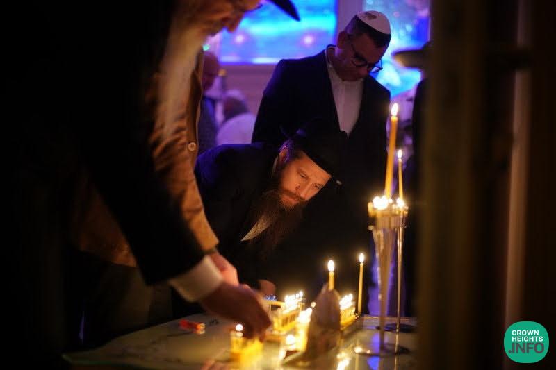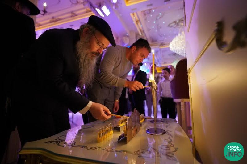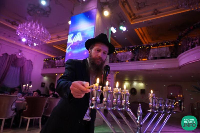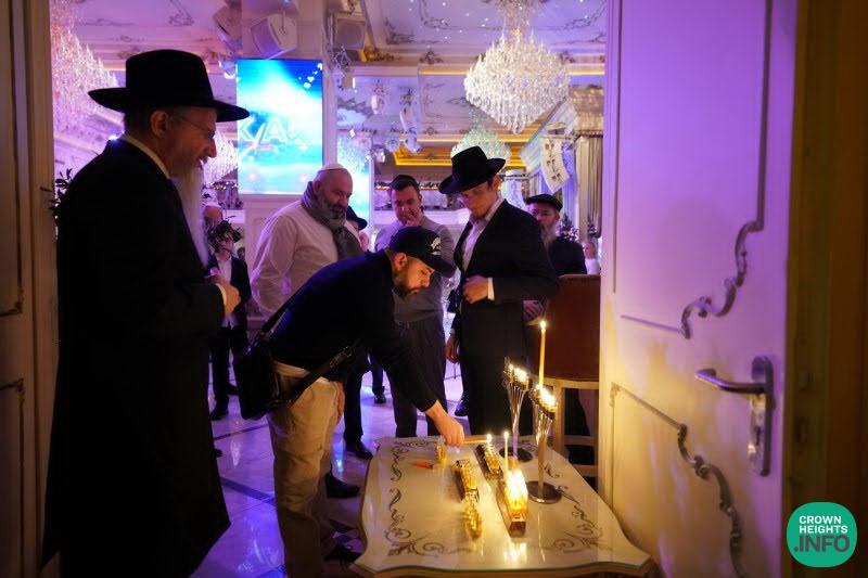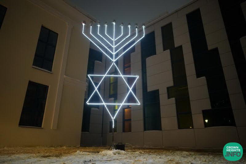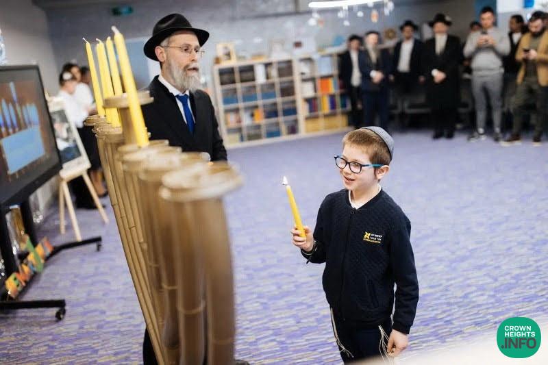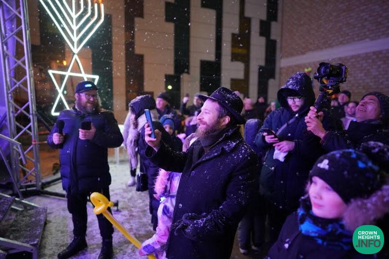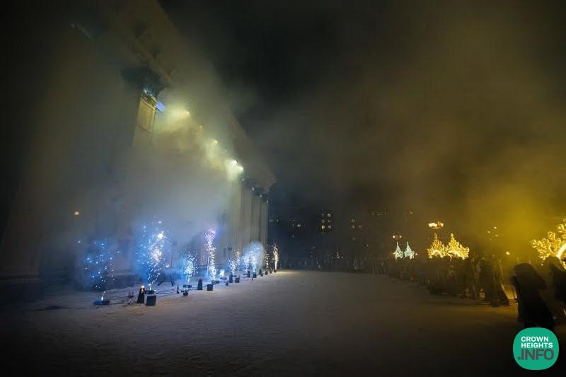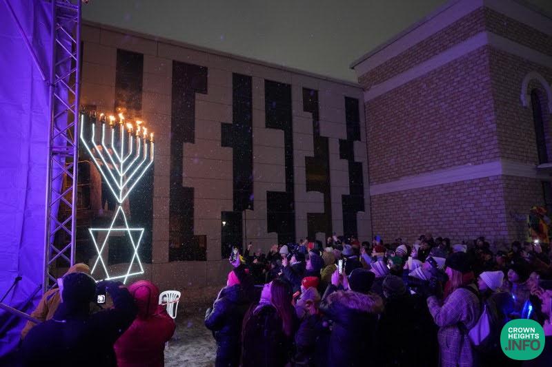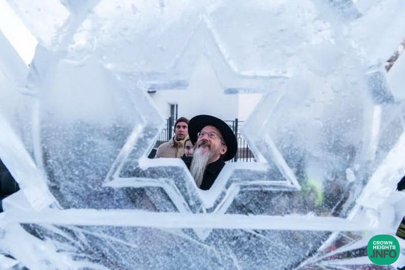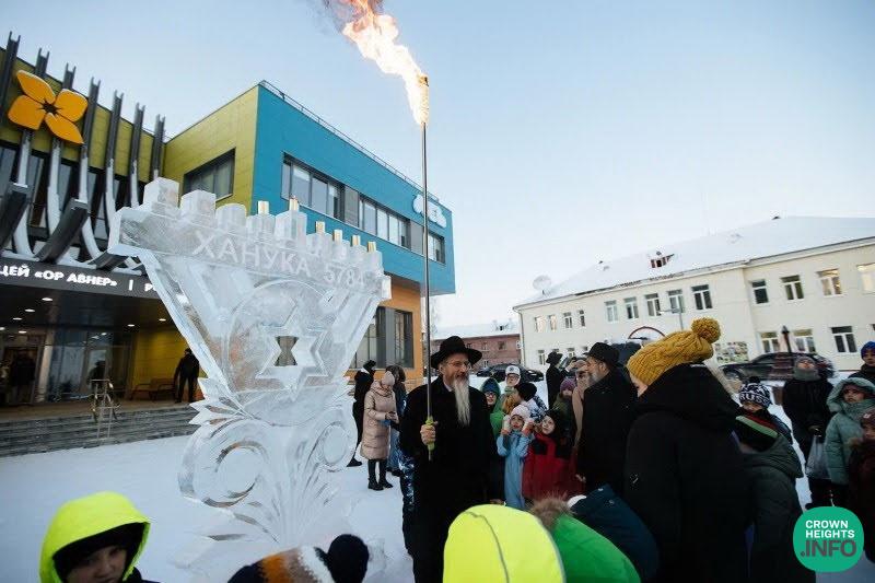 At the conclusion of the event, the entire student and staff body gathered in the school’s courtyard, where a 3-meter menorah had been carved out of ice. Rabbi Lazar was honored to light the candles in the ice menorah, after which he continued to the Beis Menachem shul and community center. There, a Chanukah event for the supporters of the community awaited.