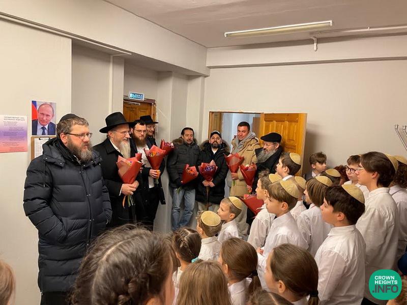 When Rabbi Lazar arrived at the school, the students enthusiastically welcomed him with a joyous song. He held a meeting with a number of the students’ parents, including some who themselves has studied in the school as youngsters. He then toured the classrooms and tested the children on Hilchos Chanukah, and was impressed by their vast knowledge. During the Chanukah party and Menorah lighting which followed, each student received Chanukah gelt.