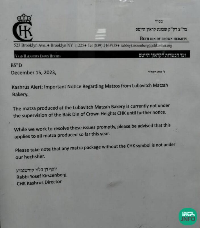 The Vaad Hakashrus of Crown Heights, which oversees the CHK Kashrus Organization has published an alert notifying that the Lubavitch Matzah Bakery in Crown Heights is presently not under their supervision.