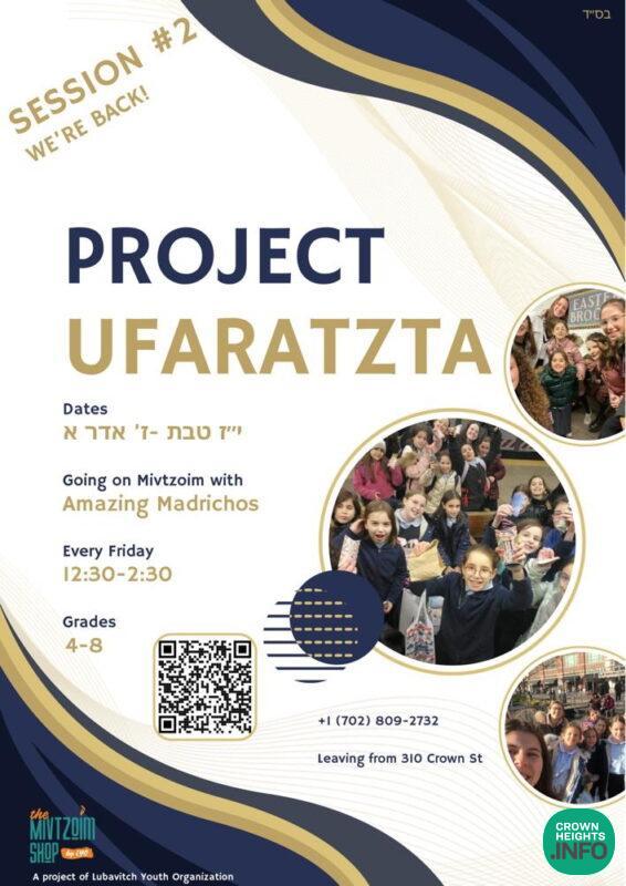 Project Ufaratzta has opened registration for its second session on Sunday, Hey Teves, open until Motzai Shabbos, 11 Teves, 12 AM. Second session will be running from Friday, 17 Teves, through Friday, 7 Adar Alef. Any girl in 4th-8th grade is welcome to sign up! The link to sign up is here: