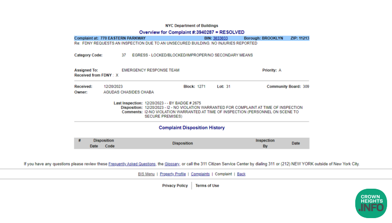 The FDNY inspectors descended on 770, and according to the DOB website, discovered no violations.
