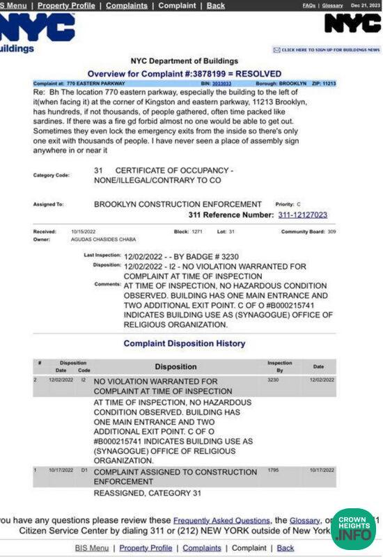 “Bh The location 770 eastern parkway, especially the building to the left of it(when facing it) at the corner of Kingston and eastern parkway, 11213 Brooklyn, has hundreds, if not thousands, of people gathered, often time packed like sardines,” the 2022 complaint said. “If there was a fire gd forbid almost no one would be able to get out. Sometimes they even lock the emergency exits from the inside so there’s only one exit with thousands of people. I have never seen a place of assembly sign anywhere in or near it.”