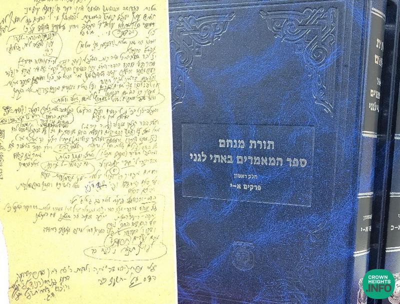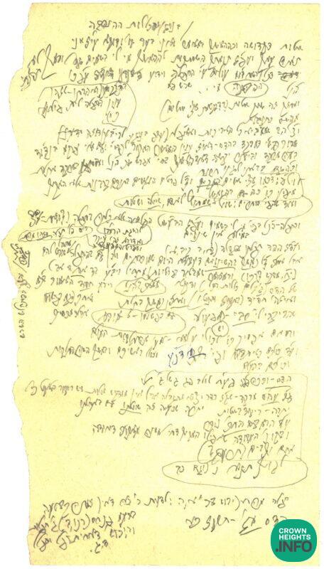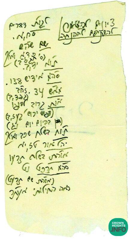 Below you can find two such examples of the Rebbe’s handwriting: 1 – a list sent by the Rebbe to Reb Yoel for Basi Legani 5729, with the instruction that those footnotes be inserted into the hanachah. 2 – A page filled with the Rebbe’s handwriting on a topic regarding Basi Ligani 5735.
