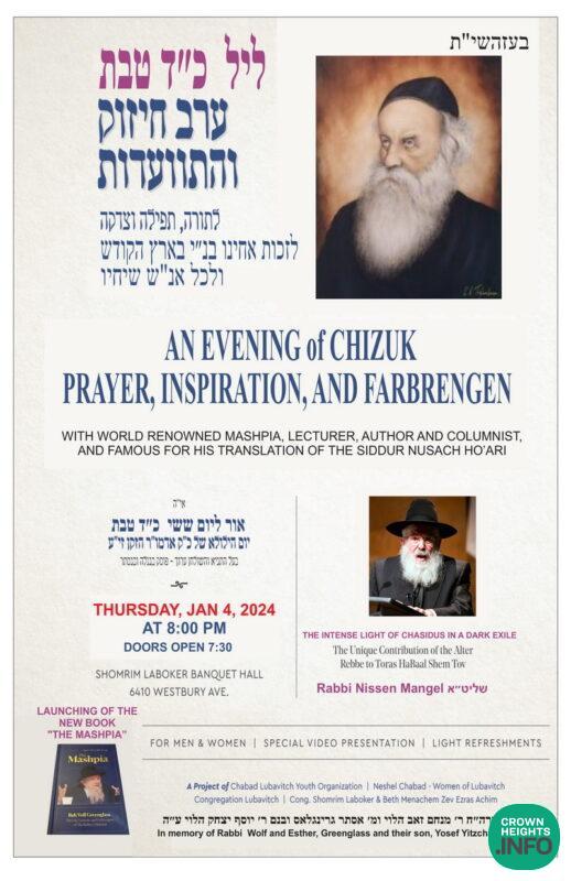 Join the Montreal community tonight, Thursday, January 4th, for a unique evening with Rabbi Nissen Mangel in honor of Chof Daled Teves and Reb Wolf Greenglass OBM.
