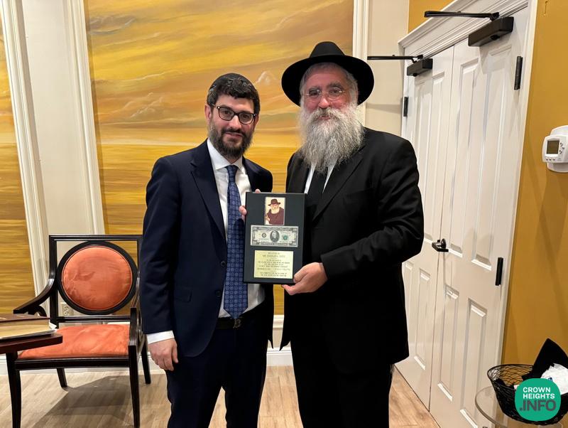 Mr. Charles Sues was honored by the committee set up to build the Mikvah and was given a plaque with a $20 bill from the Rebbe.