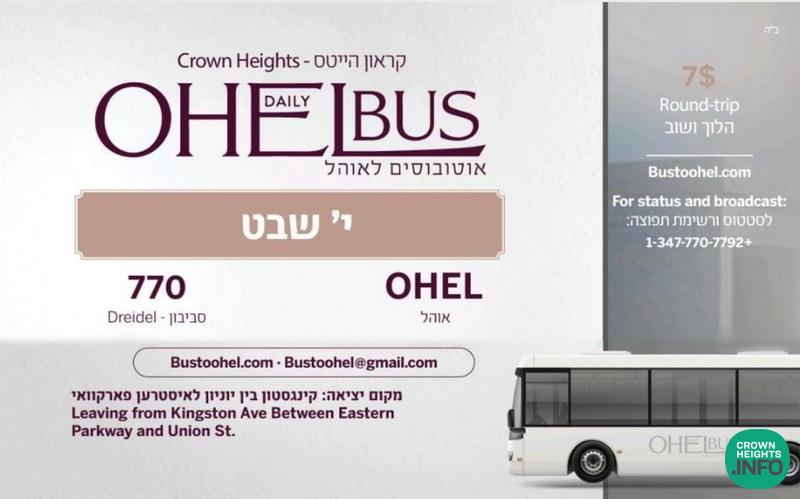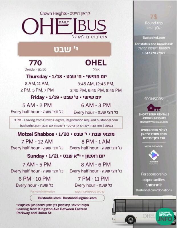 Subsidized bus service to and from the Ohel will be expanded in honor of Yud Shvat beginning Thursday, the 8th of Shvat through Sunday, the 11th of Shvat.