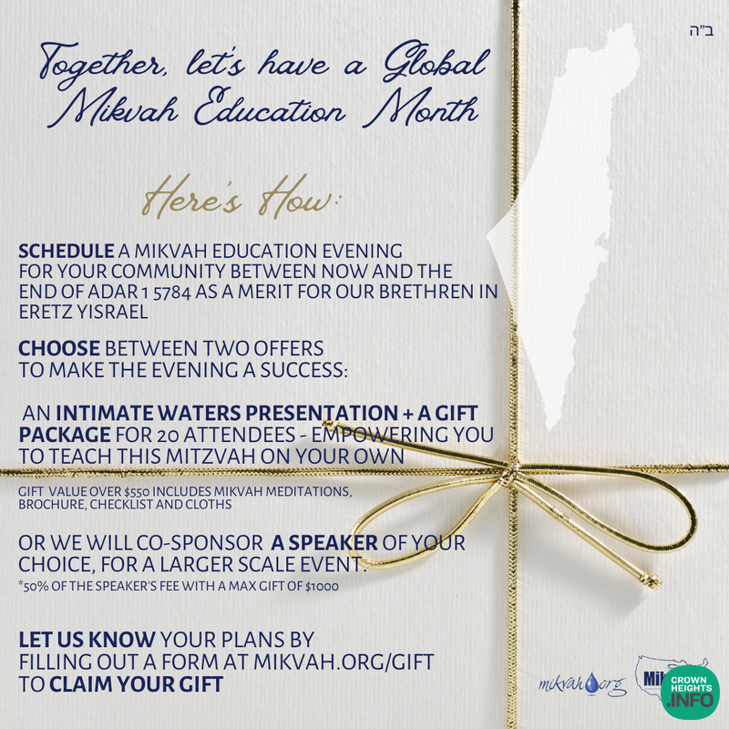 Reminder: You only have two weeks left to to join Mikvah.org and Mikvah USA in supporting Mikvah for Eretz Yisrael! Be a part of this initiative and receive your choice of a gift package to ensure the success of your event.