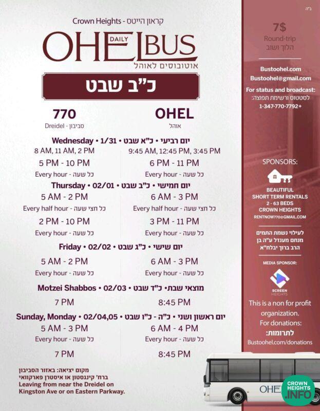Subsidized bus service to and from the Ohel will be expanded in honor of Chof Beis Shvat beginning Wednesday, the 21st of Shvat through Monday, the 25th of Shvat.