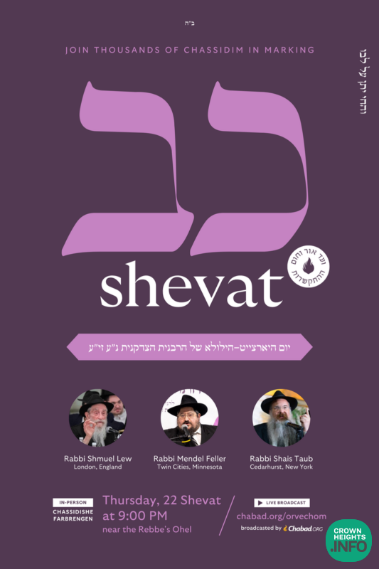 To learn more about the life of the Rebbetzin and the day of Chof Beis Shevat in the Rebbe’s presence, visit ChofBeisShevat.com and browse through the hundreds of useful resources available on the topic.