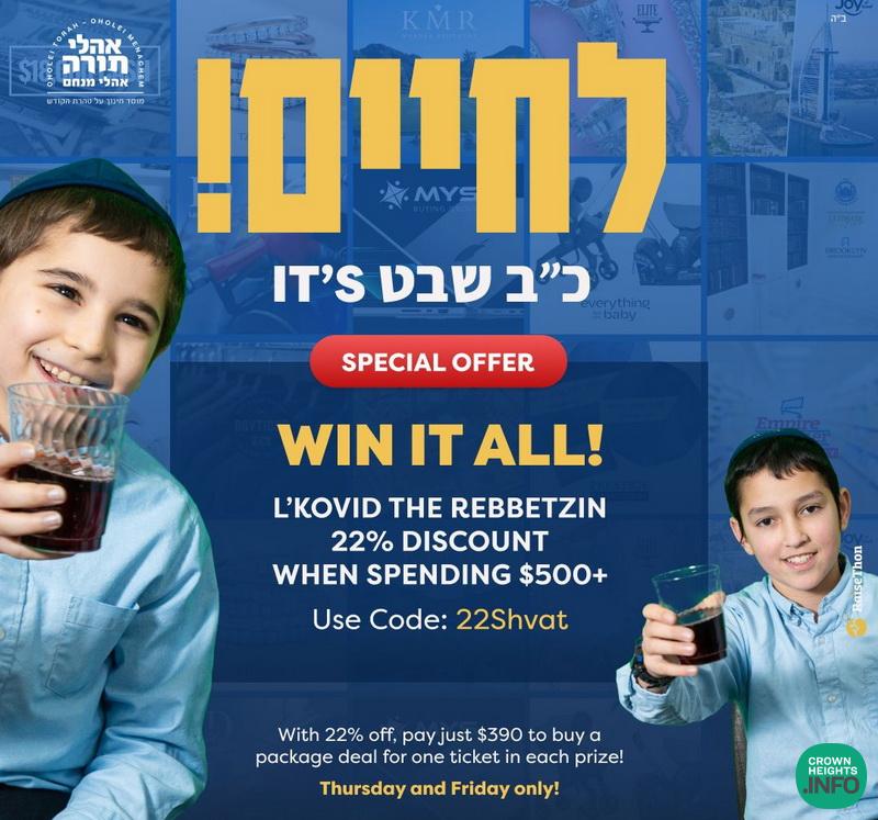 With a special code valid today and tomorrow only, the Chof Beis Shvat discount will offer you 22% off of all tickets when spending $500+ and a special rate of just $390 for the “1 ticket in each prize” package deal, including a ticket for the ultimate $18,000 cash prize.