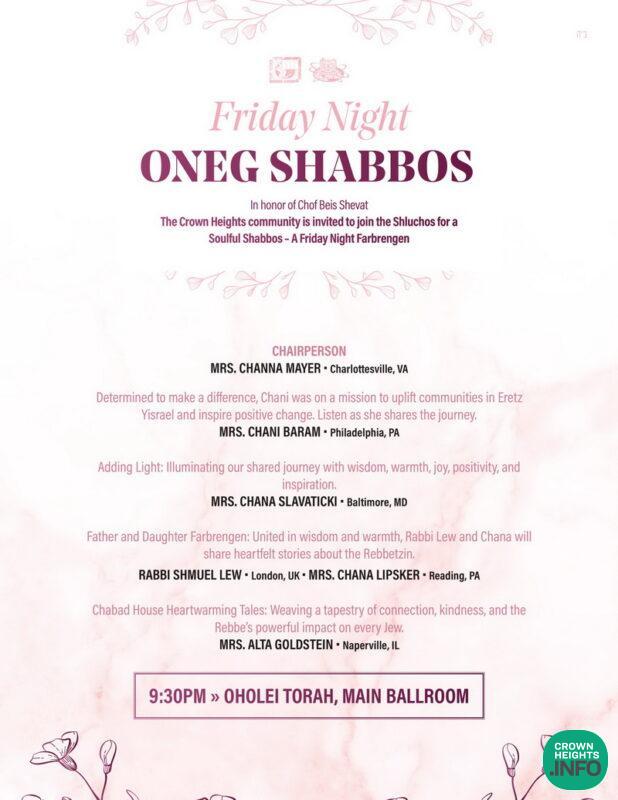 In what has become a beautiful yearly tradition, the Kinus Hashluchos invites women from the Crown Heights community to join this year’s Oneg Shabbos Farbengens, taking place this Friday night at the Kinus.