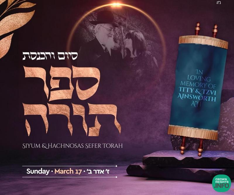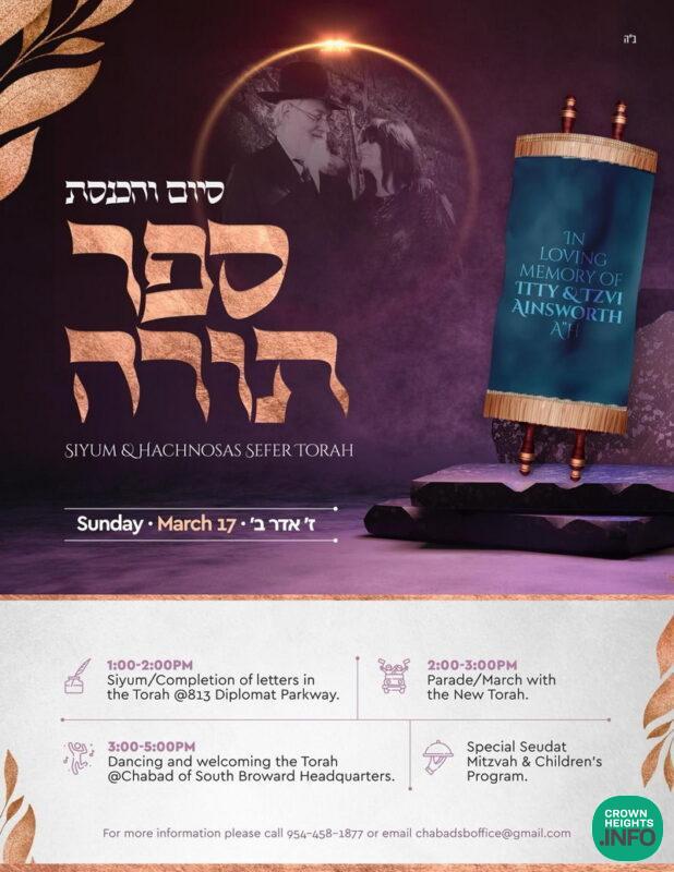 “I want to personally invite you to our community Siyum and Hachnosas Sefer Torah, on Sunday, March 17, 7 Adar Sheni,” Rabbi Raphael Tennenhaus said in a letter to the community. “This Torah is a Chabad of South Broward community project that’s being dedicated in memory of Itty and Tzvi Ainsworth, of blessed memory, sister, sister in law and brother in law of Rebbetzin Goldie and Rabbi Raphael Tennenhaus.”