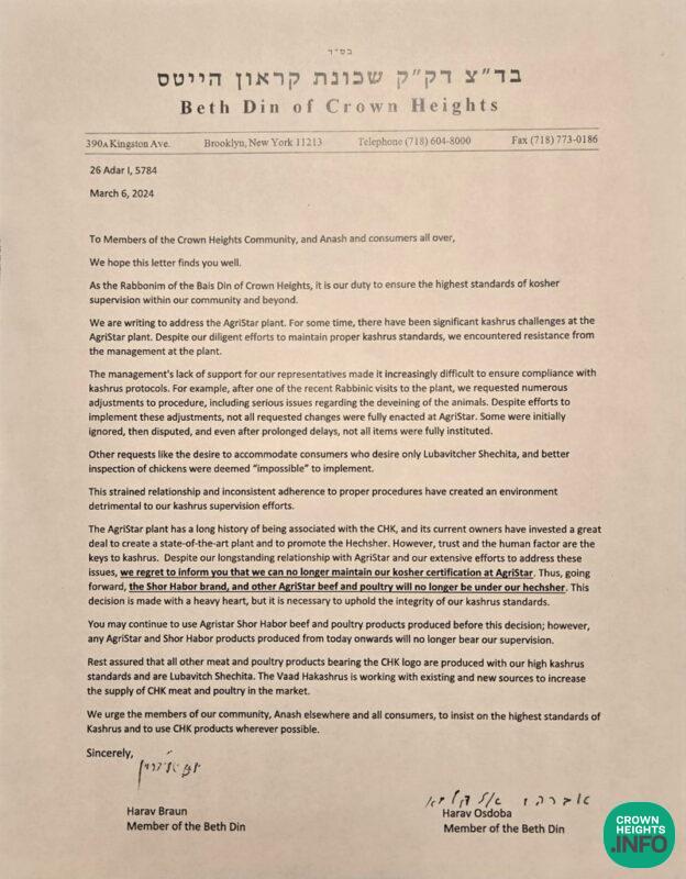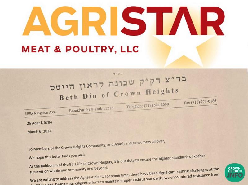 Update 11:35am: A letter released by Rabbi Meir Weismandel, a well respected Halachic authority on Kashrus and another Hechsher on AgriStar, lambasted the letter released by the Crown Heights Beis Din and called the claim of Halachic issues at the plant a lie.