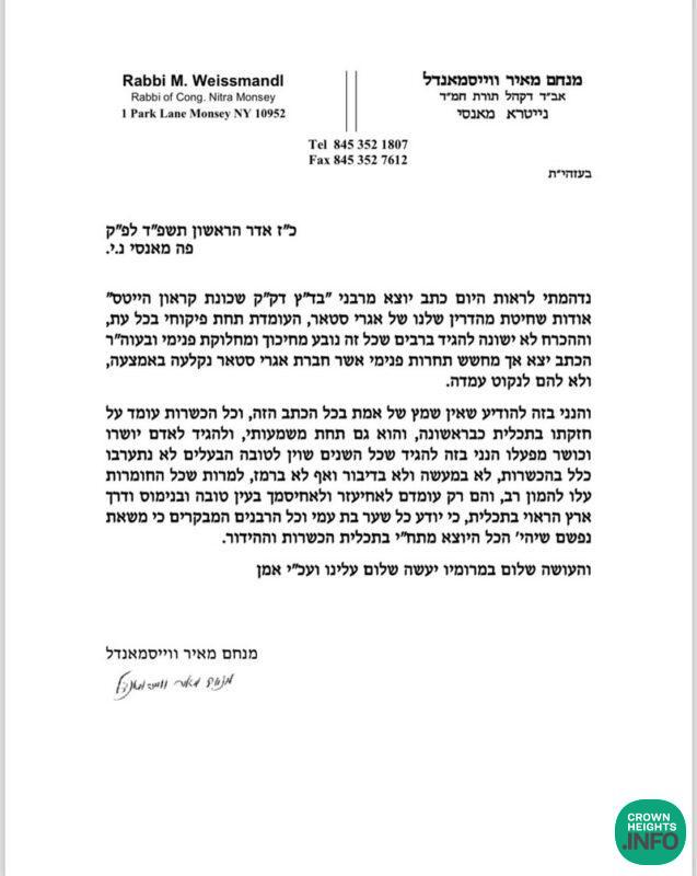 Update 11:30am: Responding to CrownHeights.info request for authentication, Rabbi Yosef Kirschenberg of the CHK confirmed the authenticity of the letter.