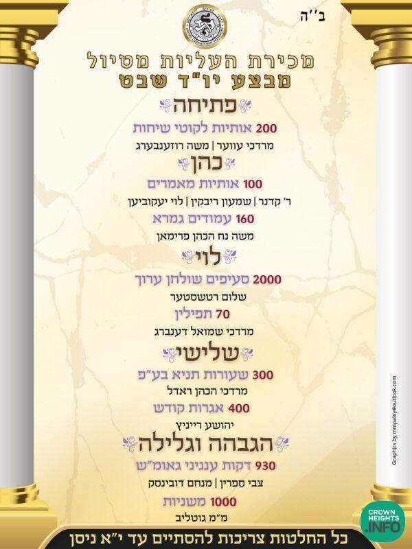 An initiative by Rabbi Rodal, being that Thursday was a day for Kriyas HaTorah, saw bochurim compete with each other to receive Aliyos. These Aliyos came with a twist: Bochurim were able to place bids with amounts of Torah that they would commit to learning throughout the year to “buy” their bid. Below are listed the successful winners of these Aliyos: