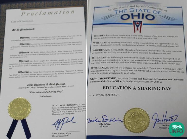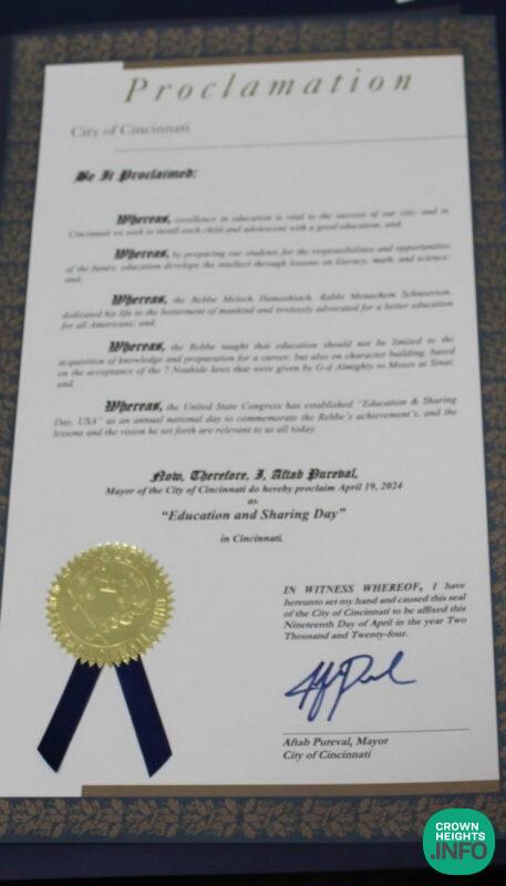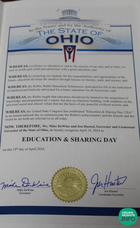 While 11 Adar Sheini is the day of Taanis Esther this year, it is also “shloshim Yom Lifnei Hachag – 30 days before 11 Nissan”. In preparation for this special day, Rabbi Gershon Avtzon – Rosh Yeshiva of Yeshivas Lubavitch Cincinnati – went to City Hall to have Mayor Aftab Puravel sign the proclamation which designates 11 Nissan as “Education and Sharing Day” in Cincinnati. In addition, he reached out to the office of Governor Mike Dewine, and he also signed the proclamation for the entire state. Both of these proclamations will be displayed in the lobby of the Yeshiva.