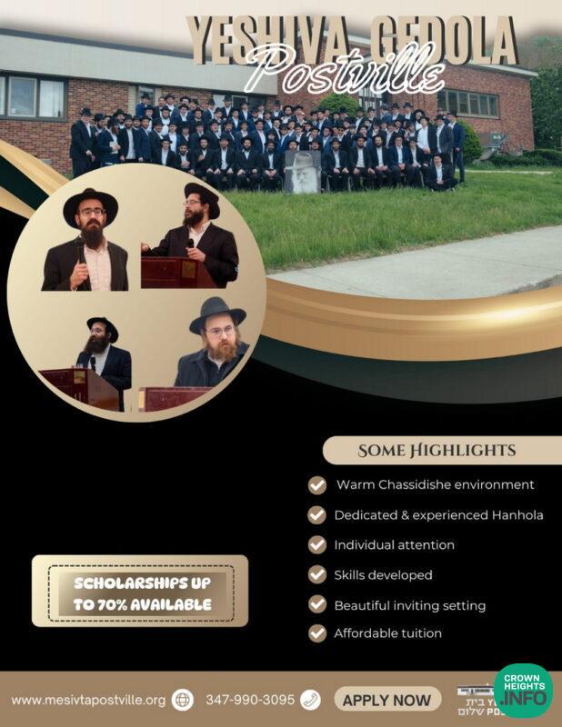 For more information about this please reach out to rabbi.zirkind@mesivtapostville.org or call 347-990-3095. Applications can be submitted at mesivtapostville.org.