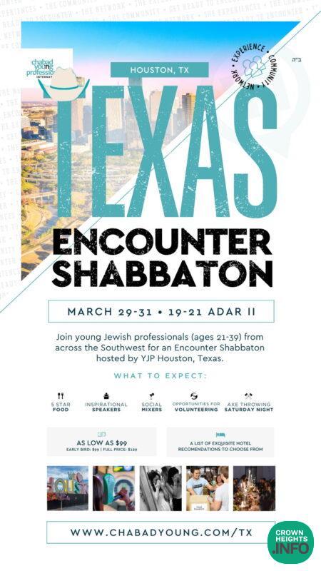 The robust program will present a meaningful and uplifting Shabbos experience hosted by Rabbi Chaim & Chanie Lazaroff and their Young Professional community in Houston. Shluchim from Chabad Young Professionals communities across the state and beyond will join with representatives from their CYP community. These include Rabbi Mendy and Mussy Levertov of CYP Austin, Rabbi Mendy and Mushka Plotkin of CYP Intown Dallas, and Rabbi Eli and Tzivia Block of S. Antonio.