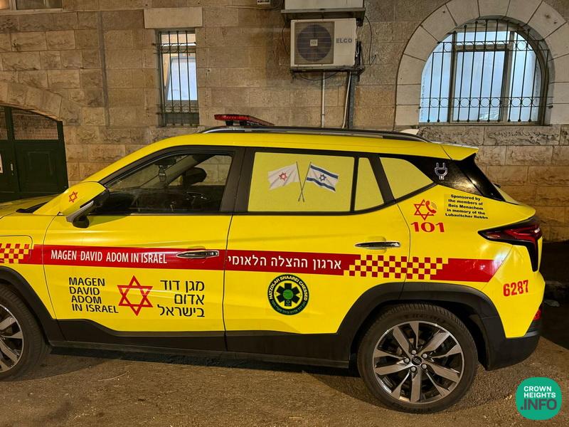 In honor of Yud Aleph Nissan, the Chabad Shul in Shaarei Chessed had the Hatzolah of Shaarei Chessed rapid response car outside their building. The response car bears the words “Sponsored by the members of Beis Menachem in memory of the Lubavitcher Rebbe”