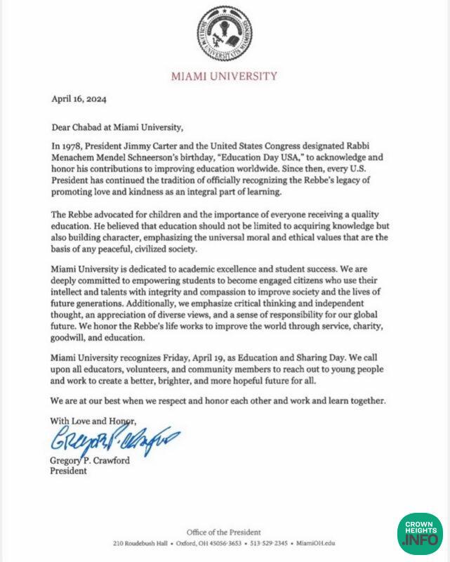 President of Miami University designates the Lubavitcher Rebbe’s birthday, the 12th of Nissan, as Education Day USA.