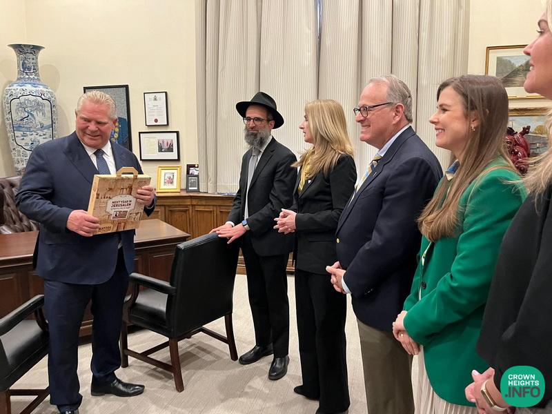 On Erev Pesach, as is his annual custom, Chabad Shliach Rabbi Yirmi Cohen of Toronto, Canada presented to his honor, the Premier of Ontario, Doug Ford and the Legislature, a box of Shmura Matza along with an explanation on the meaning of Matzah and the holiday of Pesach.